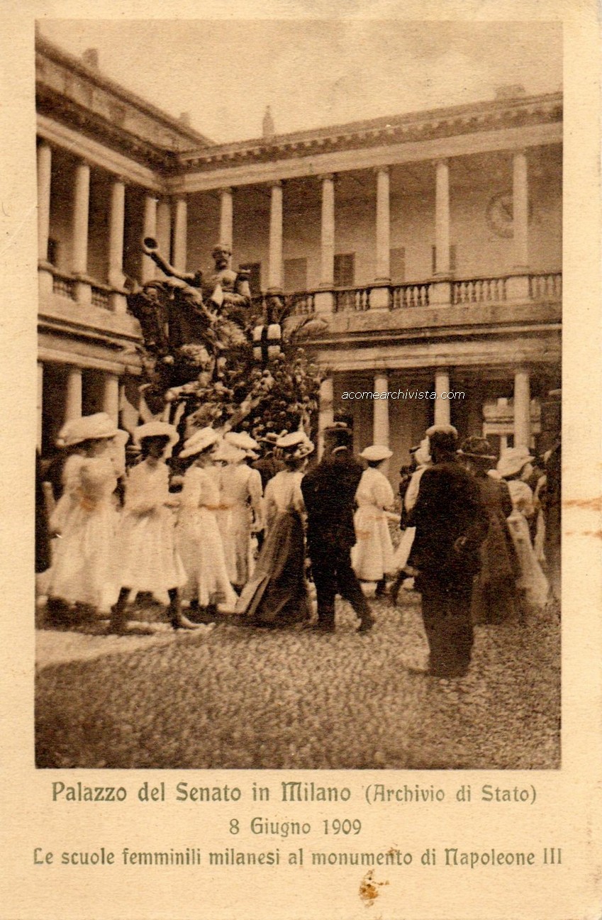 E’ l’8 giugno 1909 quando le fanciulle delle scuole milanesi visitano il monumento equestre a Napoleone III, che si ergeva allora – tronfio e maestoso – proprio in mezzo alla prima corte del Palazzo del Senato. Palazzo che ospitava, come ospita tuttora, l’Archivio di Stato. La data non era casuale: si trattava del cinquantenario dell’ingresso di Vittorio Emanuele II e di Napoleone III in città dopo la battaglia di Magenta, combattuta il 4 giugno 1859.