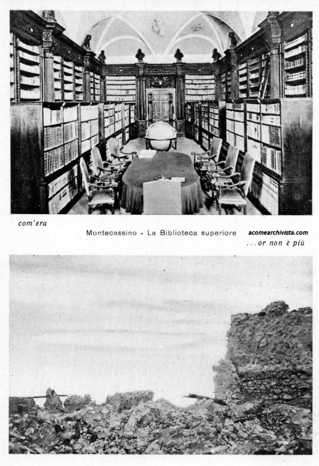 Lo splendido centro culturale dell’Abbazia cassinese, gioiello dell’umanità, distrutto durante i bombardamenti dell’ultima guerra: la sala della Biblioteca superiore, coi suoi arredi importanti e i volumi ordinati. La cartolina fa parte di una serie emessa nei primi anni dopo il conflitto per promuovere la raccolta di fondi per la ricostruzione dell’Abbazia. Continua a leggere