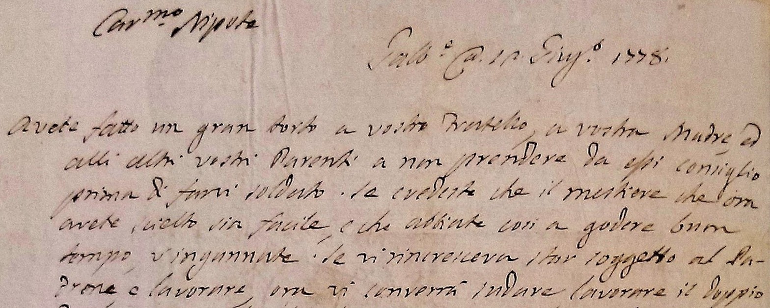 “Galbiate, adi 12 Giugno 1778. Carissimo Nipote, avete fatto un gran torto a vostro Fratello, a vostra Madre, ed alli altri vostri Parenti a non prender da essi consiglio prima di farvi soldato. Se credeste che il mestiere che ora avete scielto sia facile, e abbiate così a godere buon tempo, v’ingannate. Se vi rincresceva star soggetto al Padrone, o lavorare, ora vi converrà andare [a] lavorare il doppio, dormir pocco, far lunghi viaggi sotto l’aqua e la neve, vivere in mezzo a pericoli di morte, e star soggetto a molti padroni, che vi faranno stare a poco pane, a bastonate tante. Guardate che bel cambio avete fatto. Se il farvi soldato fu vera vocazione, supererete in parte queste dificoltà, ma se fu qualche capricio, state fresco. […] Vostro affezionatissimo Zio […]”.