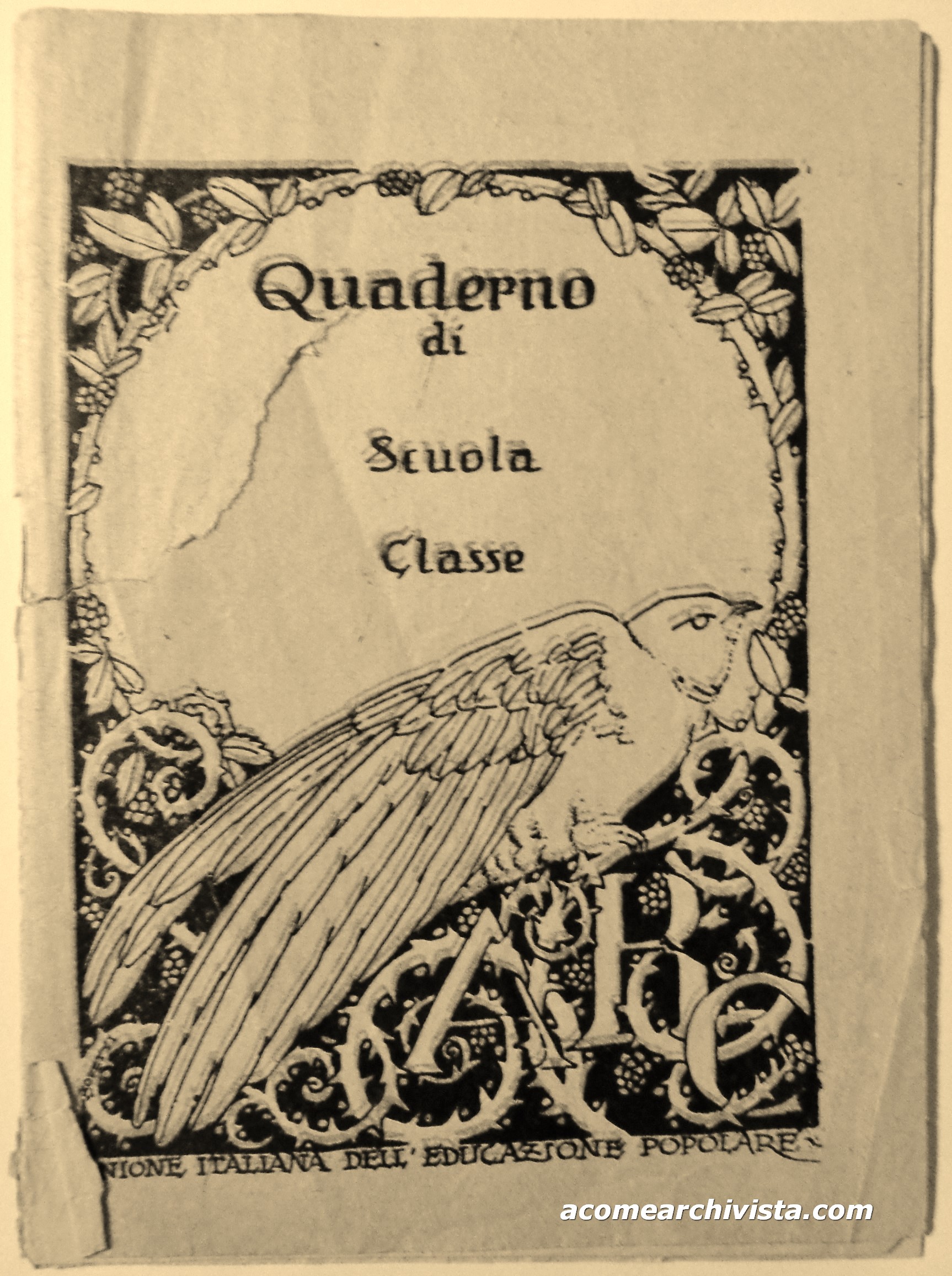 Vorrei che fosse un difetto della foto ma non è così: il quaderno dell’Unione Italiana dell’Educazione popolare è un inno alla precarietà e all’approssimazione. La carta è fragile e povDSC04667era, tutta piena di tagli e con il disegno in copertina fuori centro. Manco a dirlo – invece che aste,  letterine e pensierini di qualche scolaretto – raccoglie le pene d’amore di un innamorato respinto dei primi del Novecento. Acquistato per caso, con un piccolo lotto di documenti di altra natura giusto per fare cifra tonda, ogni tanto giace sulla libreria bassa che mi fa da comodino. Puntualmente mi addormento…